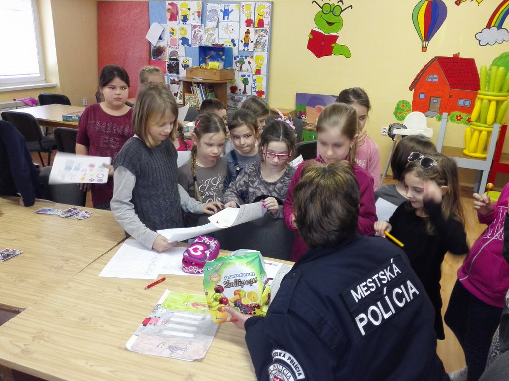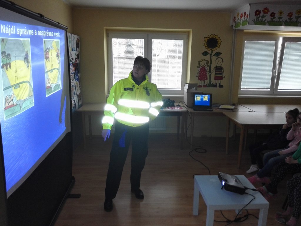 Deťom bol vysvetlený význam základných dopravných značiek, s ktorými sa denno-denne stretávajú ako chodci a cyklisti. Tiež si zopakovali pravidlá bezpečnej jazdy na bicykloch, vybavenie bicyklov a základné pravidlá bezpečného správania sa chodcov. Počas stretnutia policajti MsP rozdali školákom silikónové LED blikačky, ktoré môžu použiť na svoje bicykle a takto zvýšiť svoju bezpečnosť pri jazde. Na záver prednášky npor. Bc. Slaninová deti vyzvala, aby v rámci činnosti v CVČ namaľovali to, čo si z prezentácie zapamätali. Vo štvrtok dňa 23.02.2017 navštívila deti opäť, aby si každý jeden obrázok prezrela a s deťmi si o obrázkoch pohovorila. Deti za pekné kresby odmenila pochvalou a sladkou lízankou. Príslušníci MsP veria, že každá jedna beseda či prednáška pomôže zvýšiť bezpečnosť našich detí na cestách.