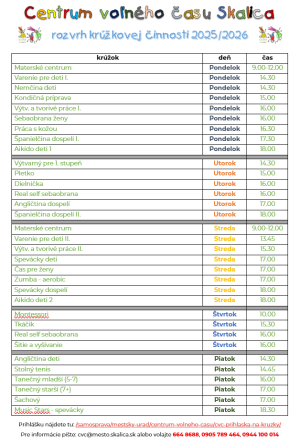 Nebolo vôbec jednoduché zladiť termíny krúžkov, pretože ich počet sa nám zvýšil a tiež počet detí. Preto sme niektoré krúžky museli rozdeliť na dva termíny. Nižšie uvádzame termíny a časy krúžkov v priestoroch centra voľného času.