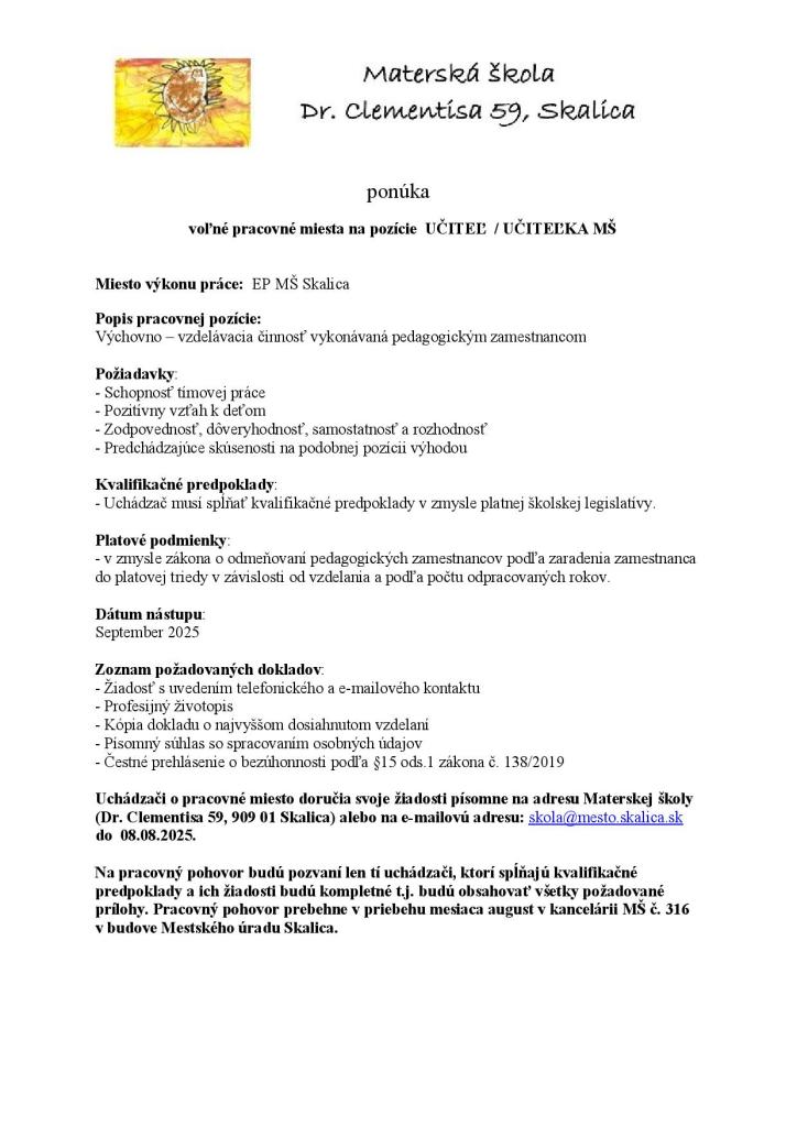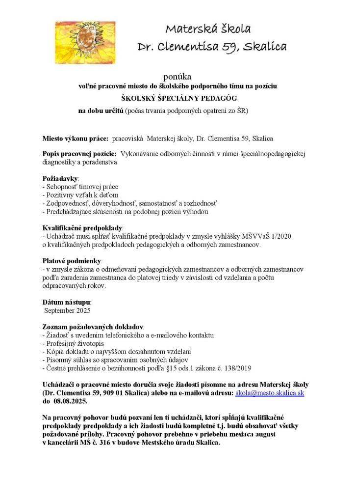 Materská škola, Dr. Clementisa 59, Skalica ponúka voľné pracovné miesta na pozície - Pedagogický asistent - Učiteľ/učiteľka MŠ - Školský špeciálny pedagóg
