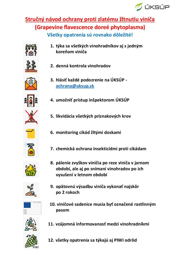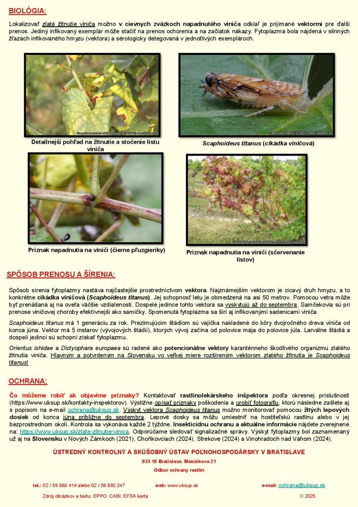 upozorňujeme Vás na výskyt nebezpečného karanténneho ochorenia viniča – Zlaté žltnutie viniča (Grapevine Flavescence dorée), ktoré sa šíri najmä prostredníctvom cikádky Scaphoideus titanus. Táto choroba môže veľmi rýchlo úplne zničiť Vaše vinohrady. Preto je potrebné sa jej zbaviť kým nie je rozšírená.